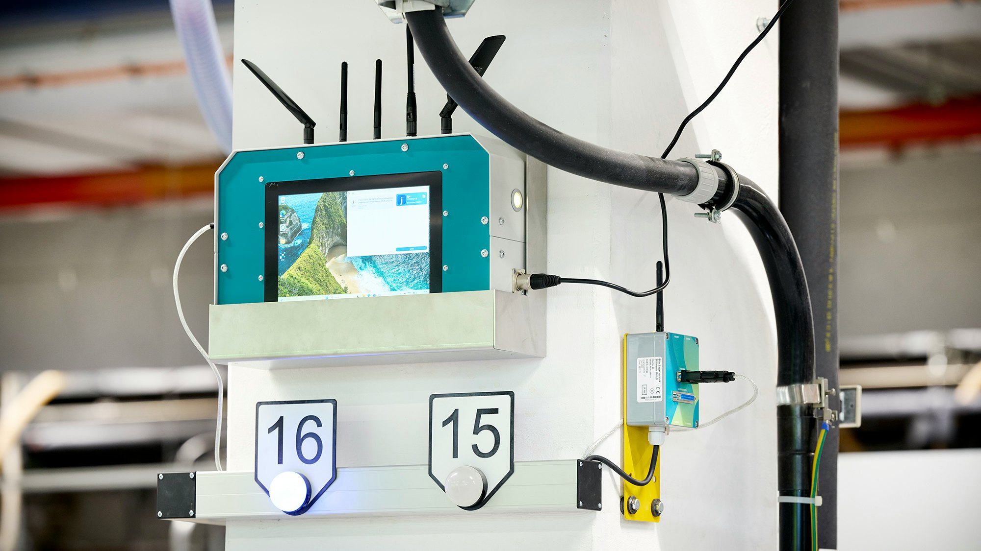 » Das smarte Interface an der Maschine, das über Lichtschranken erkennt, wann ein neuer Behälter benötigt wird und den Bedarf automatisch an das Gateway meldet.