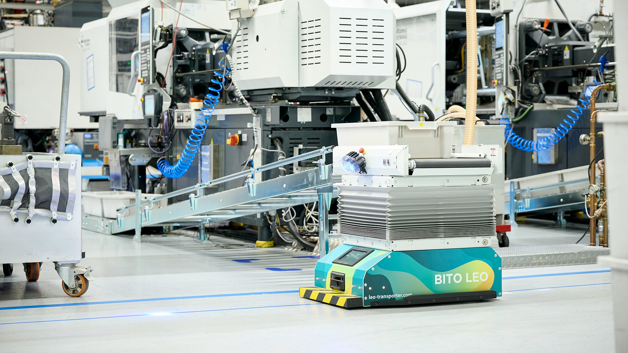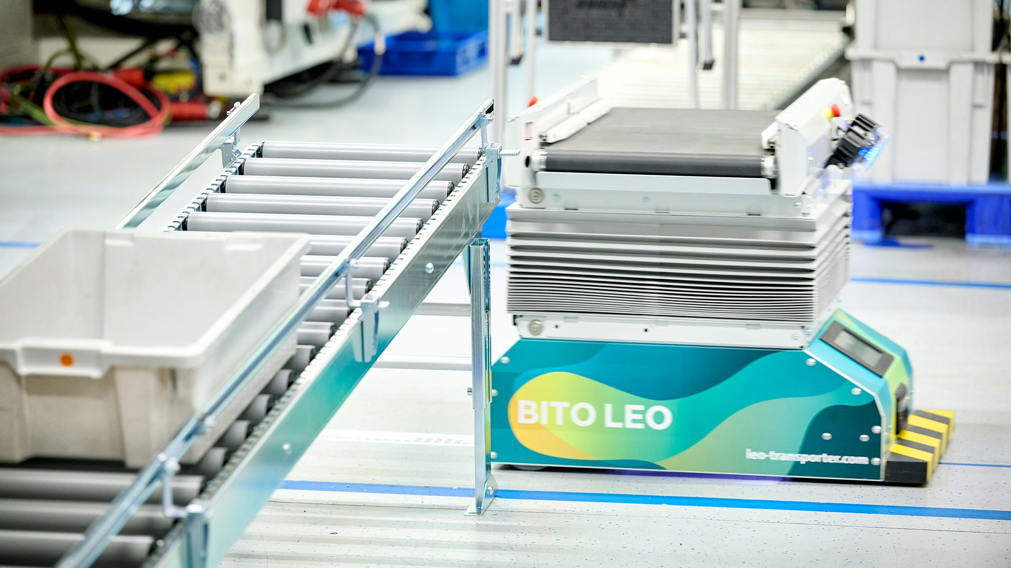 » Das autonome Transportsystem, das leere Behälter aufnimmt, zwischen Puffer und Maschinen pendelt und diese bedarfsgerecht versorgt. LEO flow verfügt über eine dynamische Höhenverstellung und arbeitet vollautomatisch.