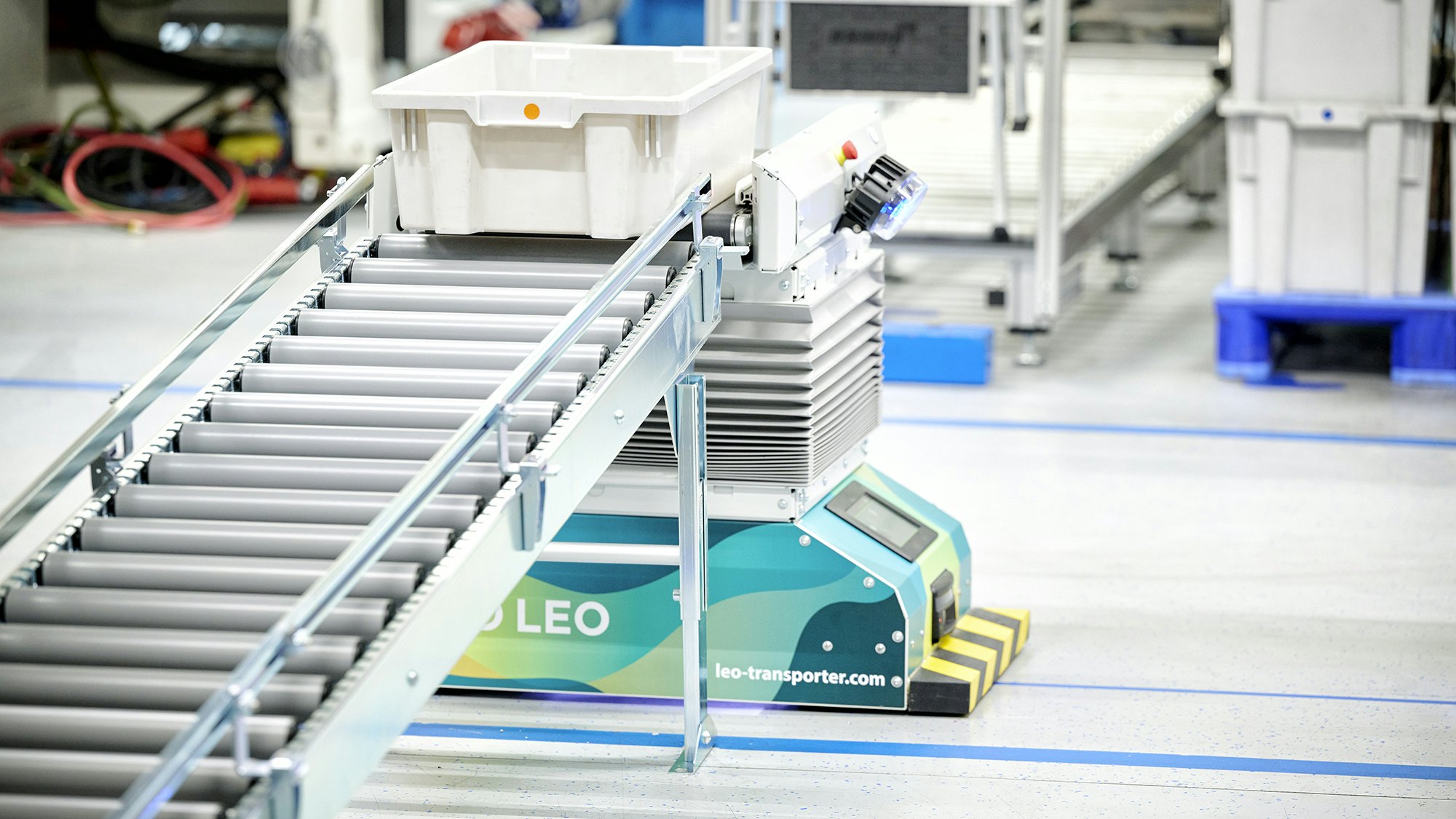 - Am montierten Rollenband übergibt LEO den leeren Behälter präzise und automatisiert